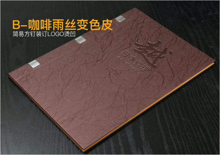 為了解決這個問題,越來越多的餐廳改用PU皮面活頁裝訂制作的菜牌。PU皮又名超纖皮,是一種再生皮,手感比真皮般柔軟,超纖皮,屬于合成皮革中的一種新研制開發的高檔皮革,屬于新型的皮料種類。因其具有耐磨、耐寒、透氣、耐老化、質地柔軟、環保以及外觀漂亮等優點,已成為代替天然皮革的最理想選擇。與PVC皮革相比,除了堅硬度不及之外,在感觀與耐用上優于PVC皮革,在工藝附加值也領先。易于彩印、激光壓印,燙色、裁剪、鏤空、雕刻。下面節選些常見的菜譜制作方式。