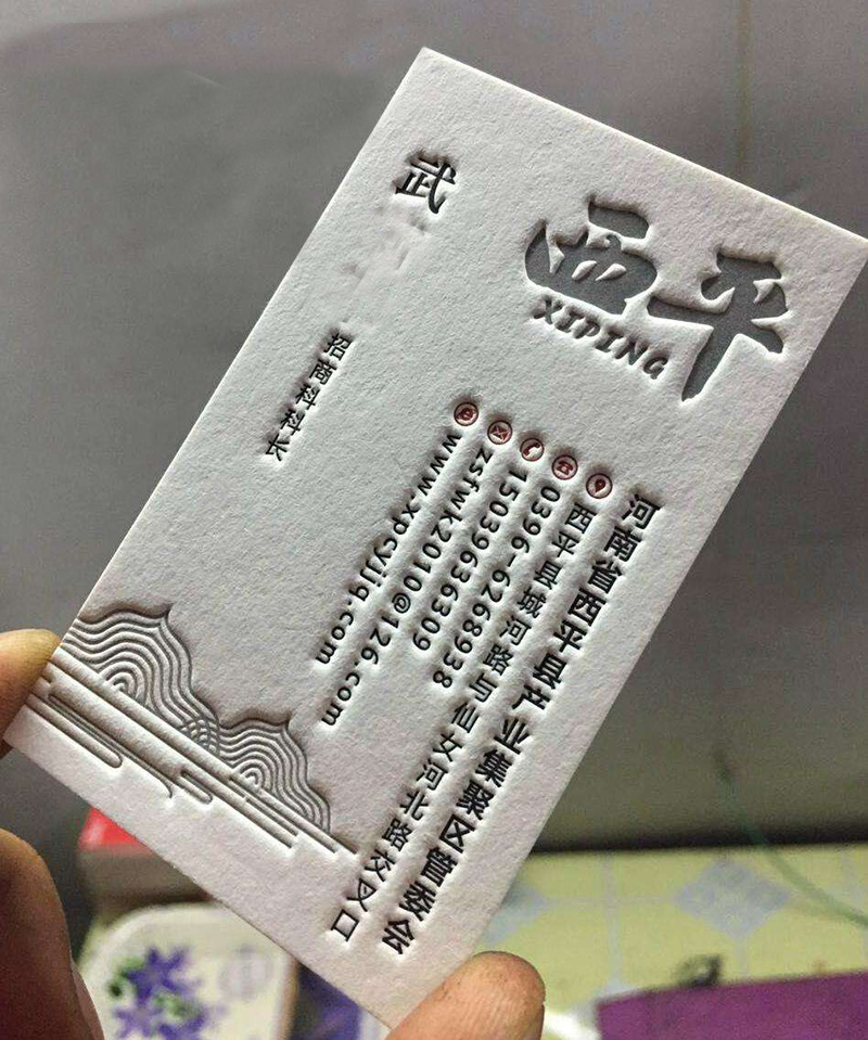 ???????這次要介紹的是擊凸名片,也可以稱作浮雕名片。這類擊凸名片多采用凹凸銅板或電雕制版工藝,通過壓印、散粉、加熱、冷卻及后加工工序等方式制成。可燙金、可上粉(水晶名片),多采用不同的特種紙來制作名片,以凸凹字為主,亦可花紋浮雕,使得名片生動美觀,富有立體感。上手觸感明顯,簡約而不簡單,是高檔名片的代表之一。具有濃濃的商務風,藝術風。特別適合經貿商務,上層社交,藝術設計人士使用。