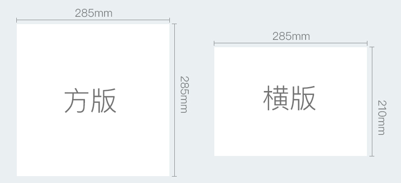 橫款與豎款的區(qū)別一般指的是長邊既285mm所在的方位,長邊為底邊則是橫款,長邊若為高,則是豎款。如果底邊與高都是285mm,則是12寸方款畫冊。同樣的道理應用于6寸及8寸的畫冊上。6寸:100mm X 145mm;8寸: ?140mm X 195mm;