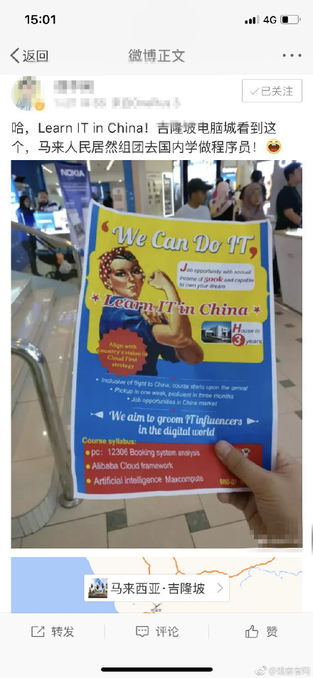 近日,有位在馬來西亞旅行的中國游客在微博上發布了一張有趣的宣傳單。并配上感言,馬來人民居然組團去國內學程序猿! 內容是一家馬來西亞中介機構提供馬來人到中國去學習中國AI技術的服務。沒錯,是一張留學培訓宣傳單。但乍一看, 還以為健身房傳單,難道設計師從藍翔嗎。內容到是較吸引人,介紹中不光強調0基礎速成,而且還以—年入50萬馬幣以及3年就能買房為噱頭!中國作為人工智能領域的“新貴”,開始吸引老外組團來當程序員了!彩印宣傳單