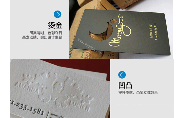 ? ? ? 無論是數(shù)字印刷還是傳統(tǒng)印刷,配套的印后工藝不可相互替代。如數(shù)字印刷配套的印后工藝有數(shù)字切割、激光雕刻、數(shù)字式燙印等技術(shù);傳統(tǒng)印刷配套的印后工藝有模切、套色或不套色的擊凸、壓凹、各種電化鋁燙印等,合理地運(yùn)用這些工藝,會(huì)令名片“錦上添花”;應(yīng)用不合理,將會(huì)是“畫蛇添足”,筆者建議印后工藝不可堆砌,一款名片,配合1~2個(gè)印后工藝為宜。